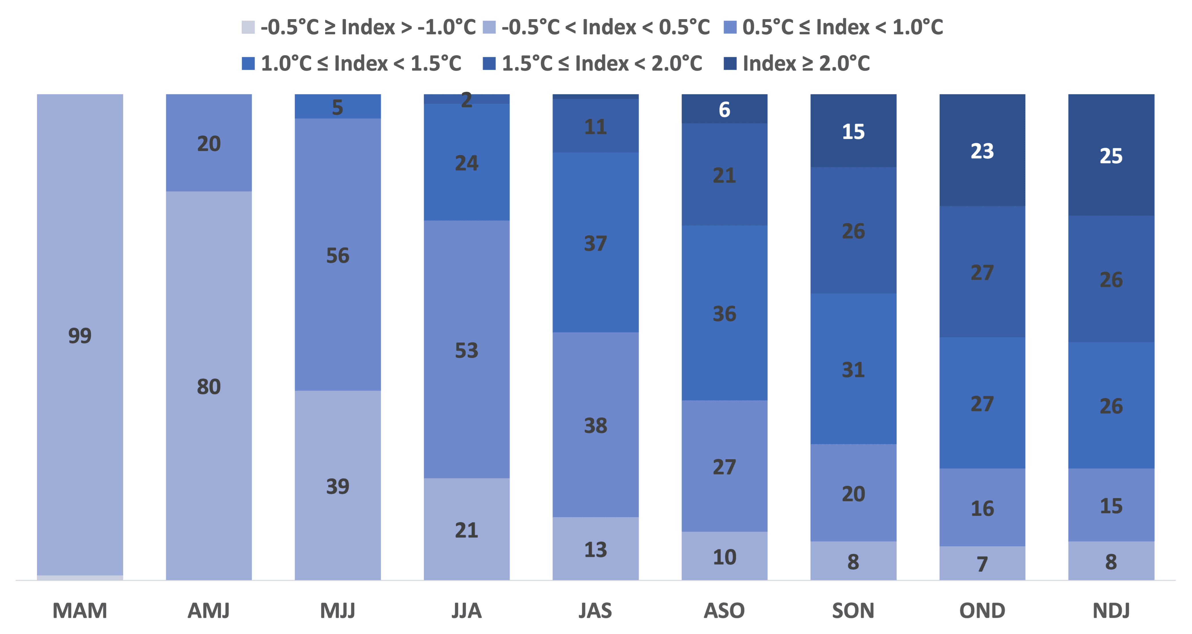 Acronyms refer to three-month periods such as March, April, and May (MAM), April, May, and June (AMJ), etc. Source: National Oceanic and Atmospheric Administration