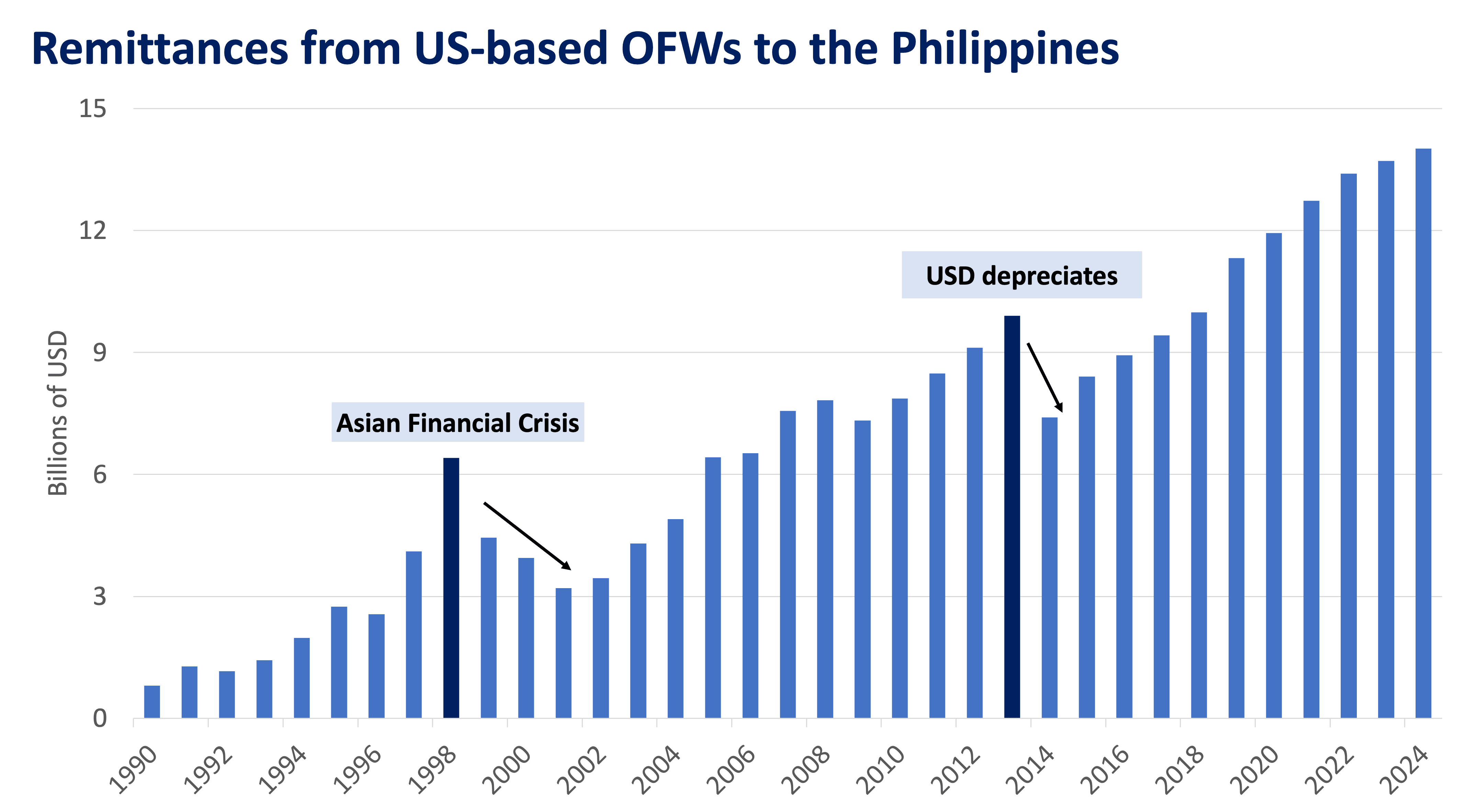 OFWs sent a record high USD 39.3 billion in remittances throughout 2024 and payments continue to grow yearly, as depicted on the graph below.