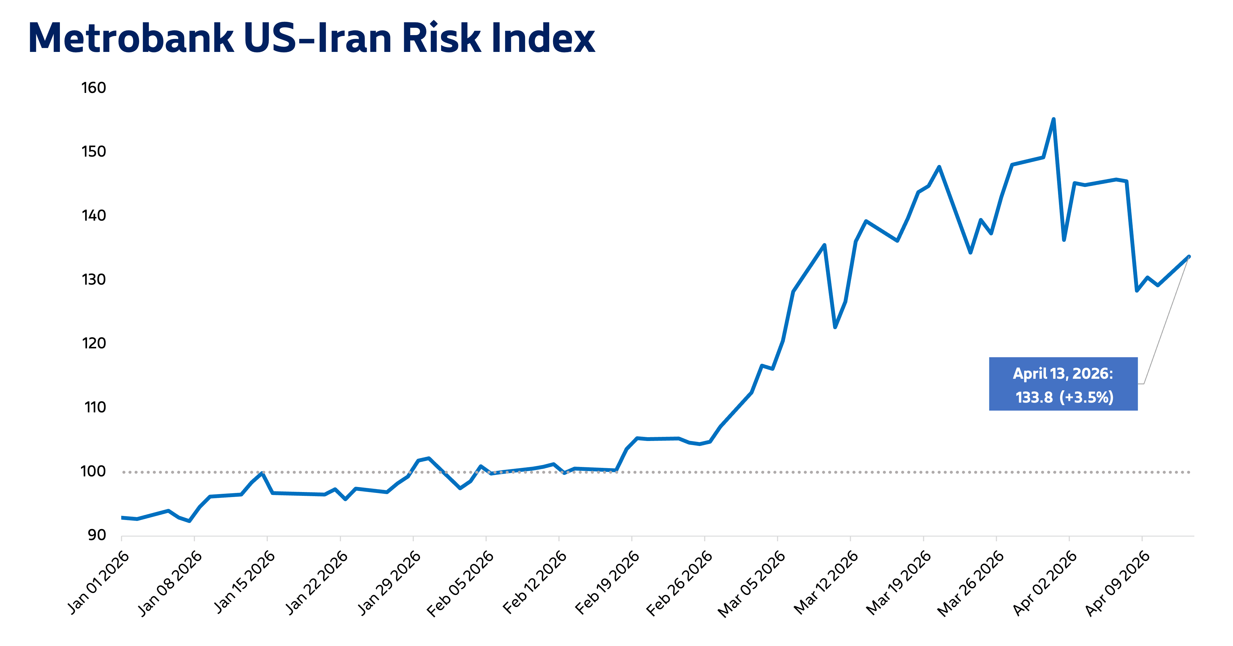 Metrobank’s US-Iran Risk Index settled at 133.8 on April 13, 3.6% higher than its value of 129.2 on April 10.