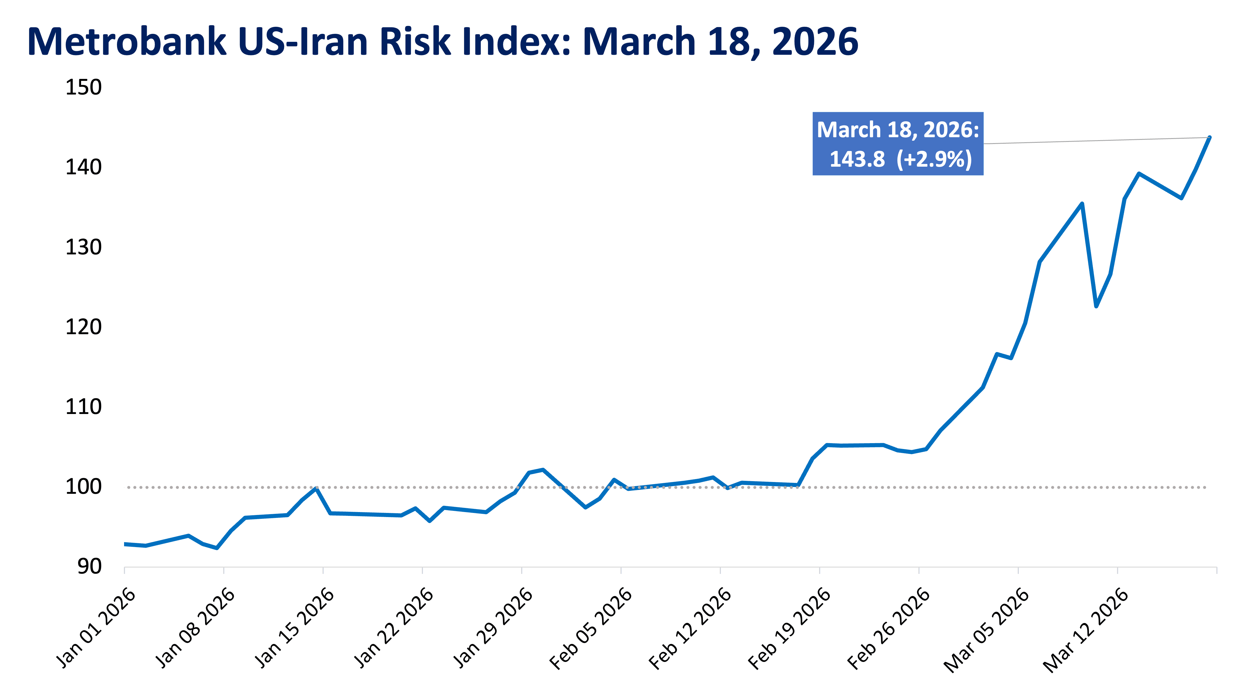 Metrobank’s US-Iran Risk Index settled at 143.8 on March 18, 2026, 2.9% higher than the previous day. This marks another all-time high for the index.