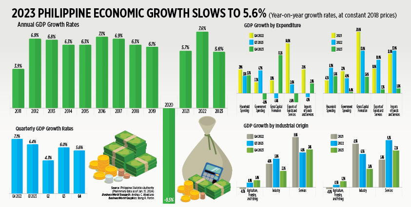 In the fourth quarter, GDP expanded by 5.6%, slower than the revised 6% GDP growth in the third quarter and the 7.1% expansion in the fourth quarter of 2022. It was also below market expectations, based on a BusinessWorld poll that yielded a 5.7% estimate.