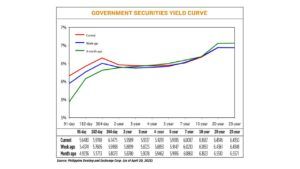 GS yields, which move opposite to prices, went up by a week-on-week average of 6.24 basis points (bps), based on the PHP Bloomberg Valuation Service Reference Rates as of April 20 published on the Philippine Dealing System’s website.
