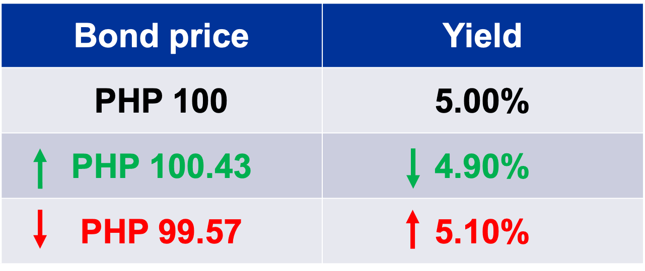 When interest rates are hiked due to policy changes by a central bank, bond prices fall, and vice versa. In the case of the Philippines, the Bangko Sentral ng Pilipinas (BSP) is the one that controls the rates. This inverse relationship is a fundamental concept in bond investing and is often referred to as interest rate risk.
