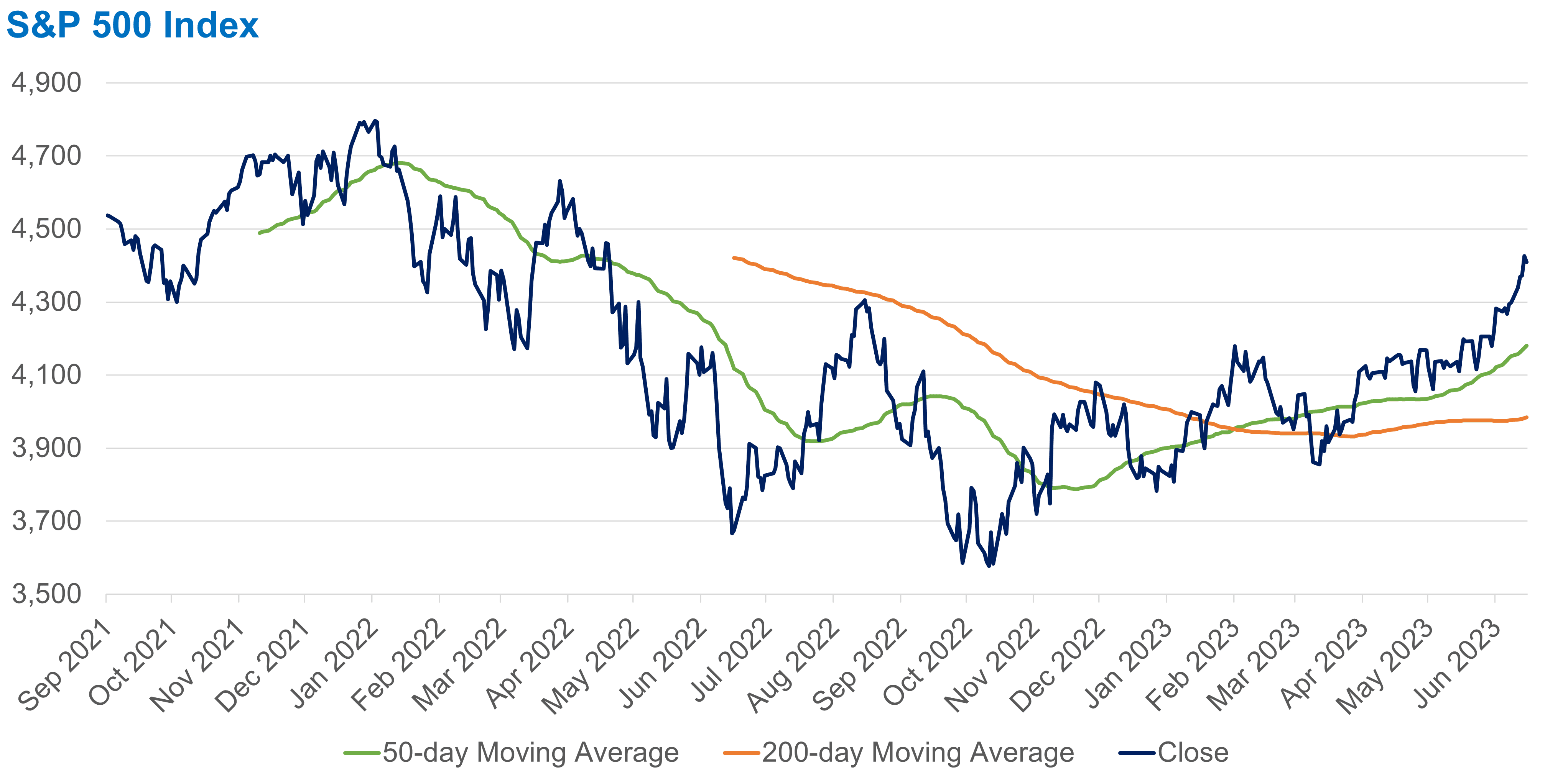 From a technical standpoint, the commonly accepted definition of a bull market is when stock prices rise by 20%. Another simple indicator would be a higher short-term average compared to long term average. This indicator is commonly referred to as the “golden cross” and appears when the long term (200-day) moving average dips below the short term (50-day) average, signaling a chance for a market breakout.