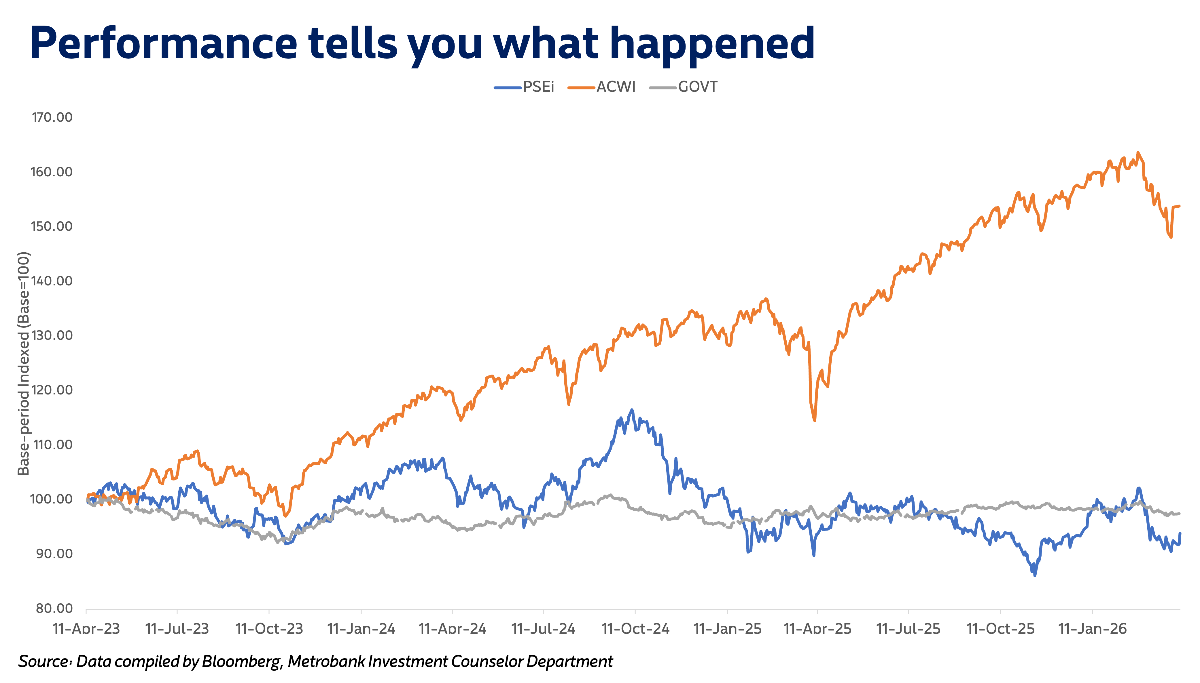 It compares three familiar building blocks of many portfolios: Philippine equities (PSEi), global equities (MSCI ACWI), and government bonds (proxied by GOVT: iShares US Treasury Bond ETF)—with all assets indexed to a base value of 100.