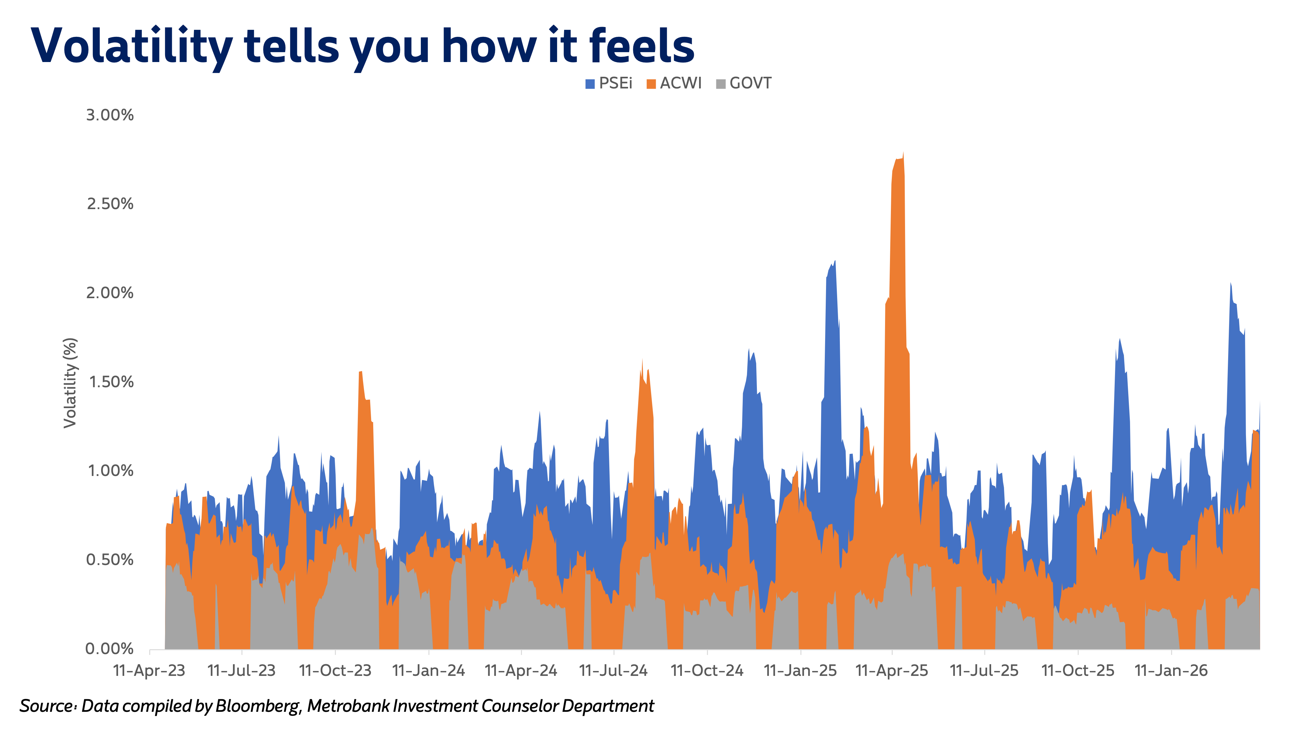 Stress testing is not about the outcome. Chart 2 shows short-term rolling volatility for the same three assets: PSEi, MSCI ACWI, and US government bonds.