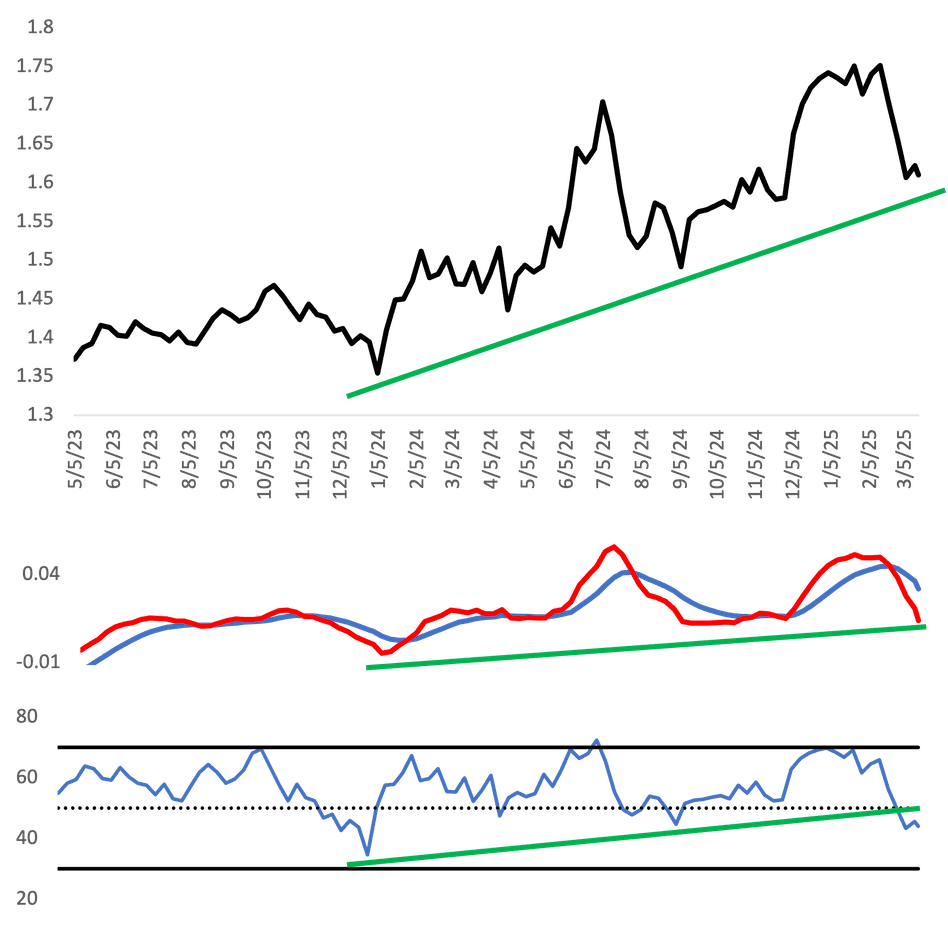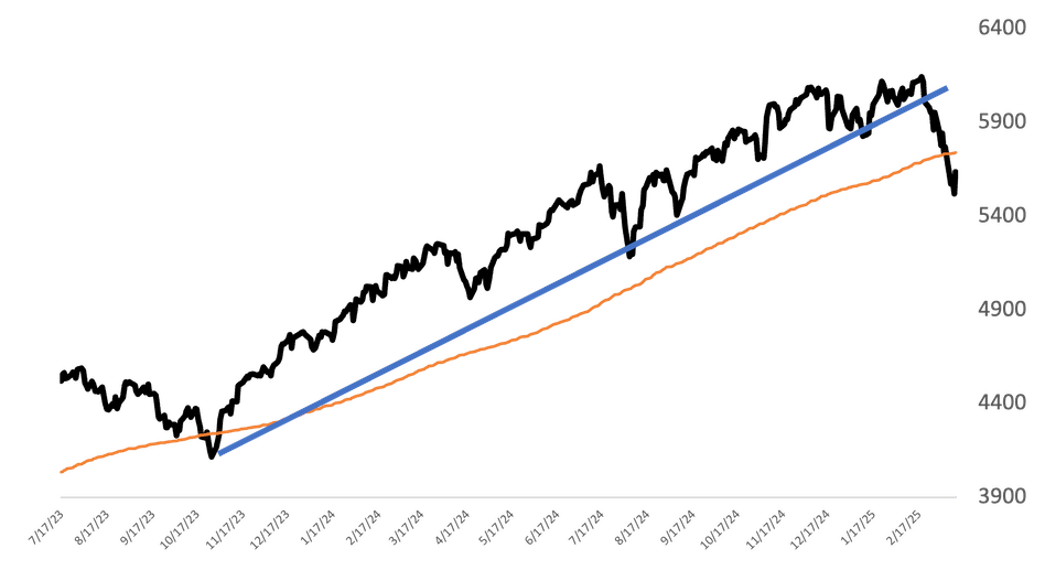 The S&P 500, which has a significant allocation to growth stocks, fell below the 5,850 uptrend (blue line) that began in October 2023. This break in the trend suggests a strategic shift from a “buy and hold” approach to a more mean-reverting strategy—”buy low, sell high.”
