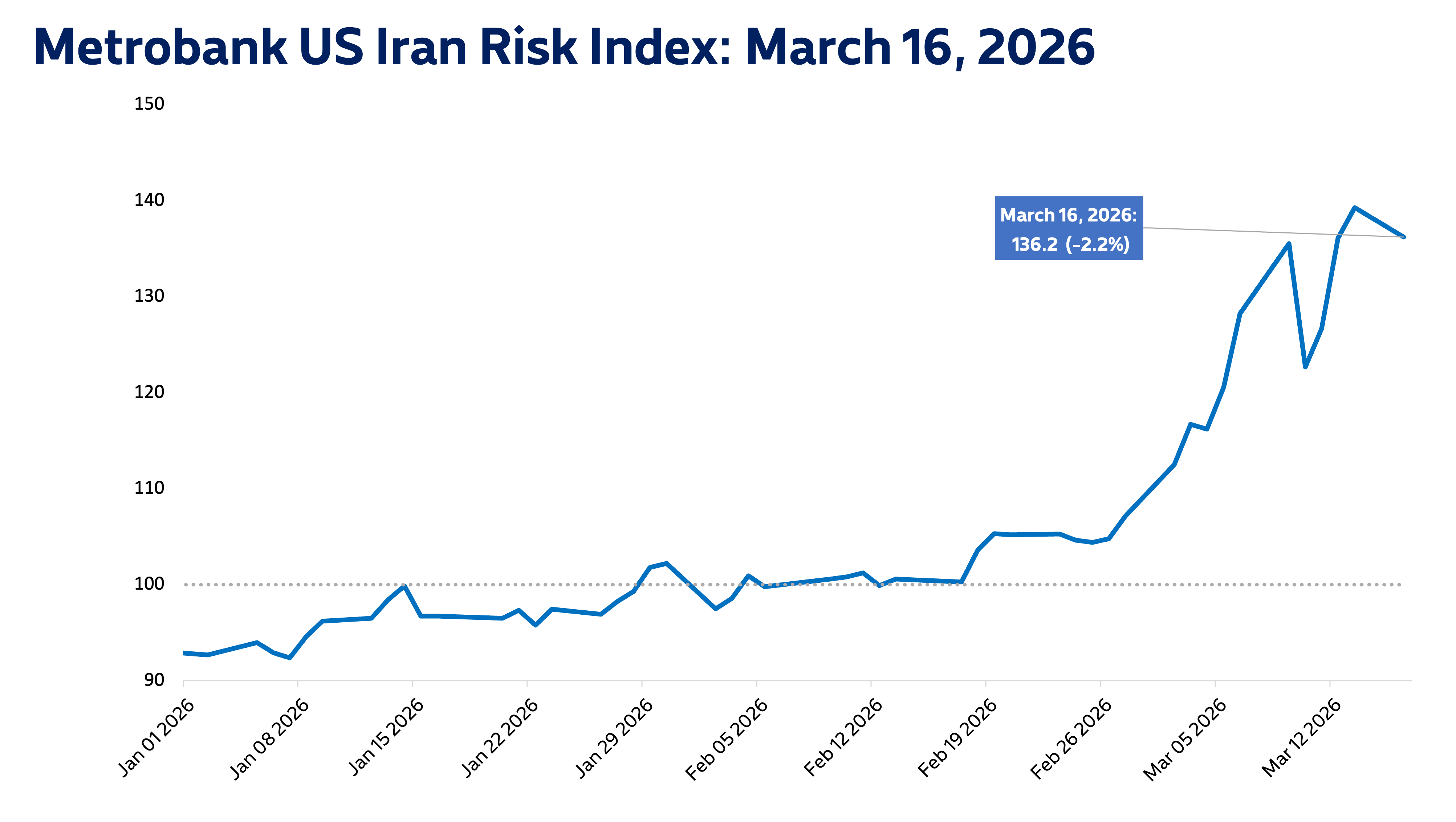 Metrobank’s US-Iran Risk Index settled at 136.2 on March 16, 2026, 2.2% lower than the previous day.