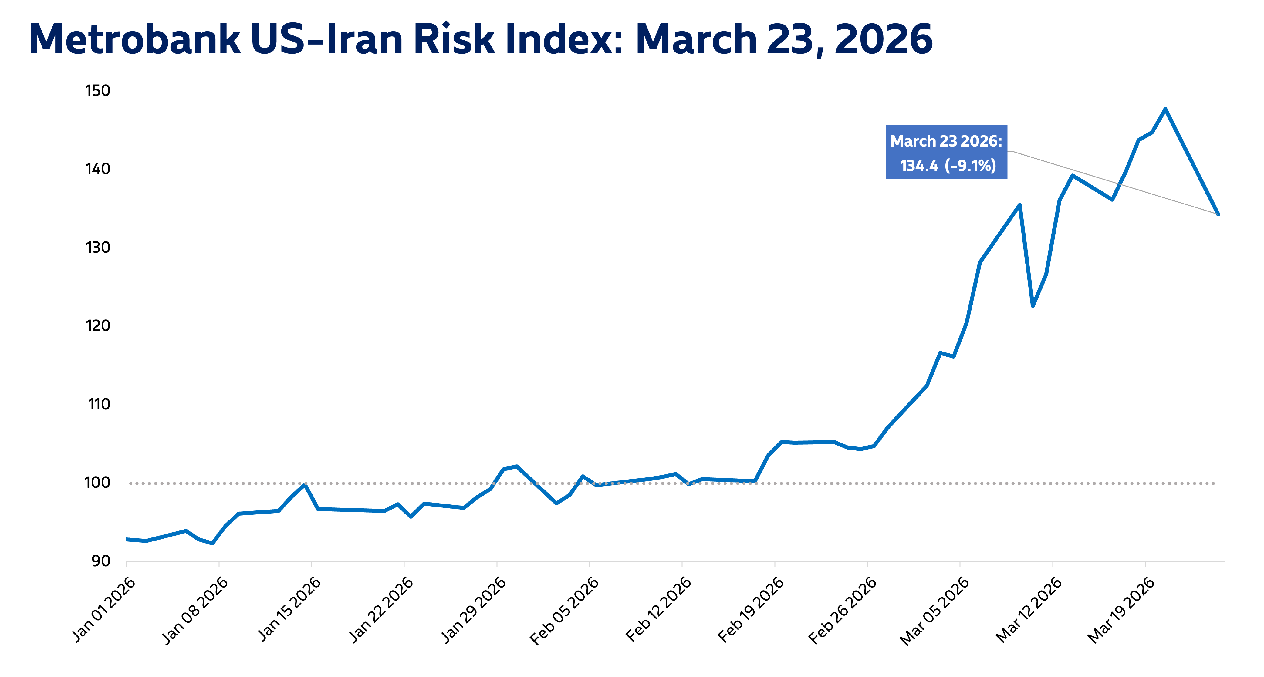 Metrobank’s US-Iran Risk Index settled at 134.4 on March 23, 2026, 9.1% lower than the level hit on March 20. This reversal can be attributed to financial market players pricing in less risk due to a fall in oil prices.