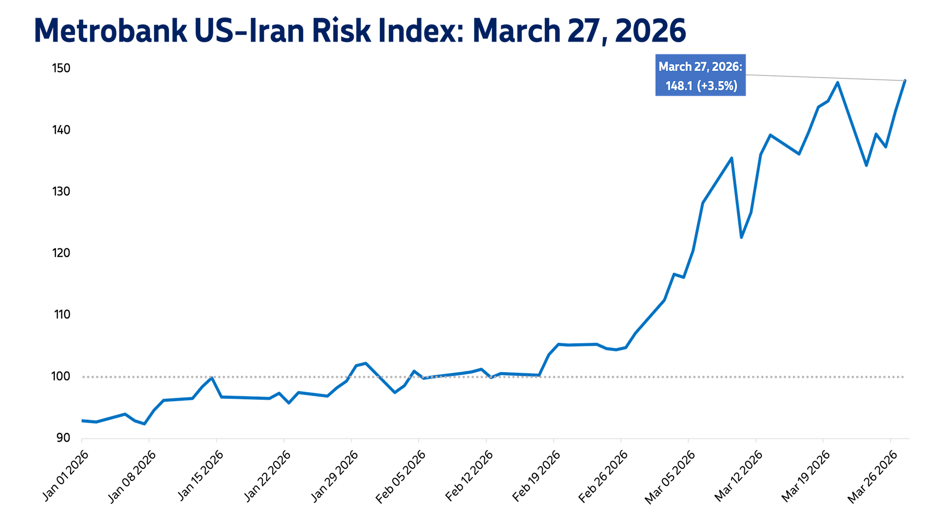 Metrobank’s US-Iran Risk Index settled at 148.1 on March 27, 2026, 3.5% higher than the previous day. This marks a new all-time high for the index.