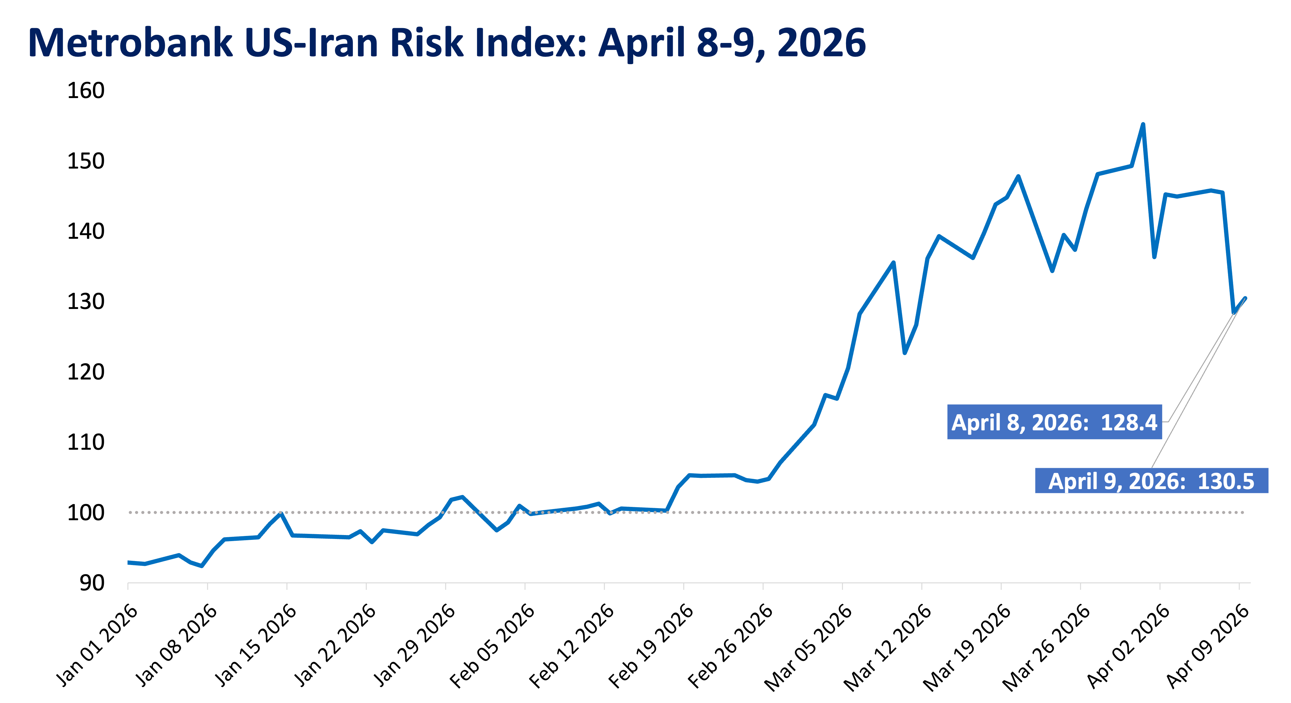 Metrobank’s US-Iran Risk Index settled at 128.4 on April 8 and 130.5 on April 9, easing almost to its lowest levels in nearly a month.