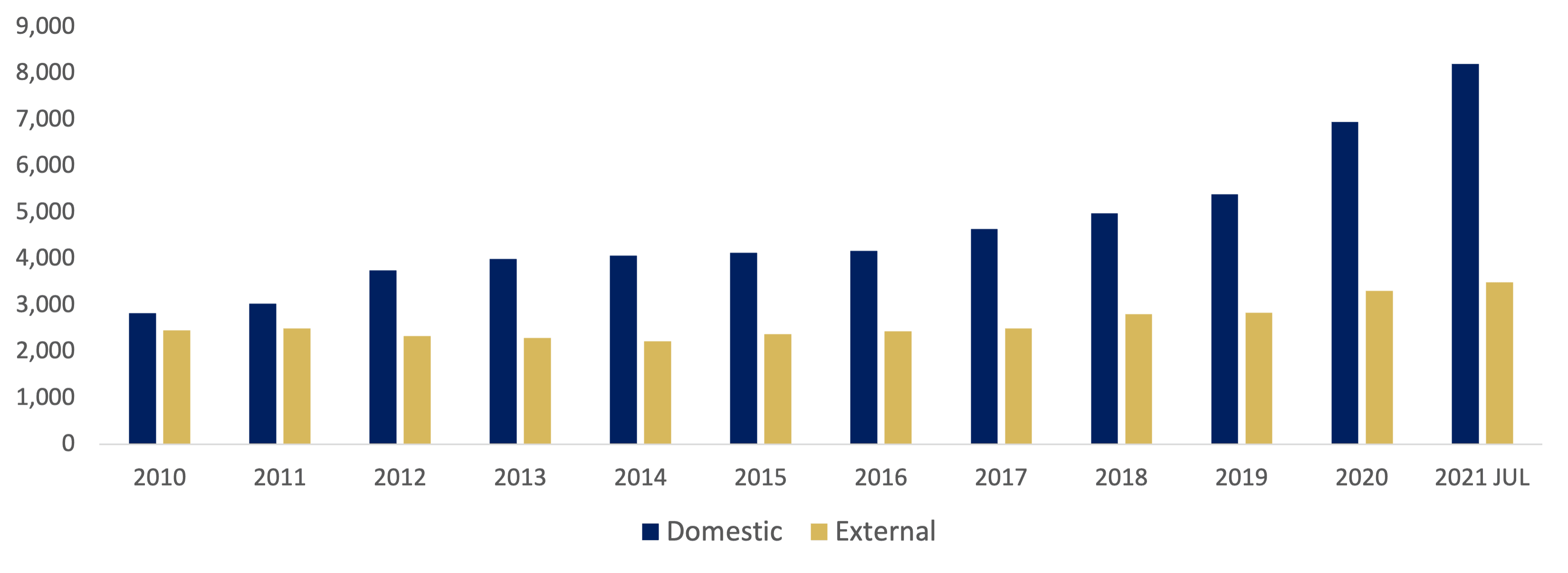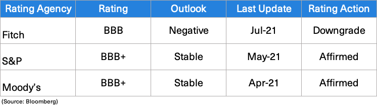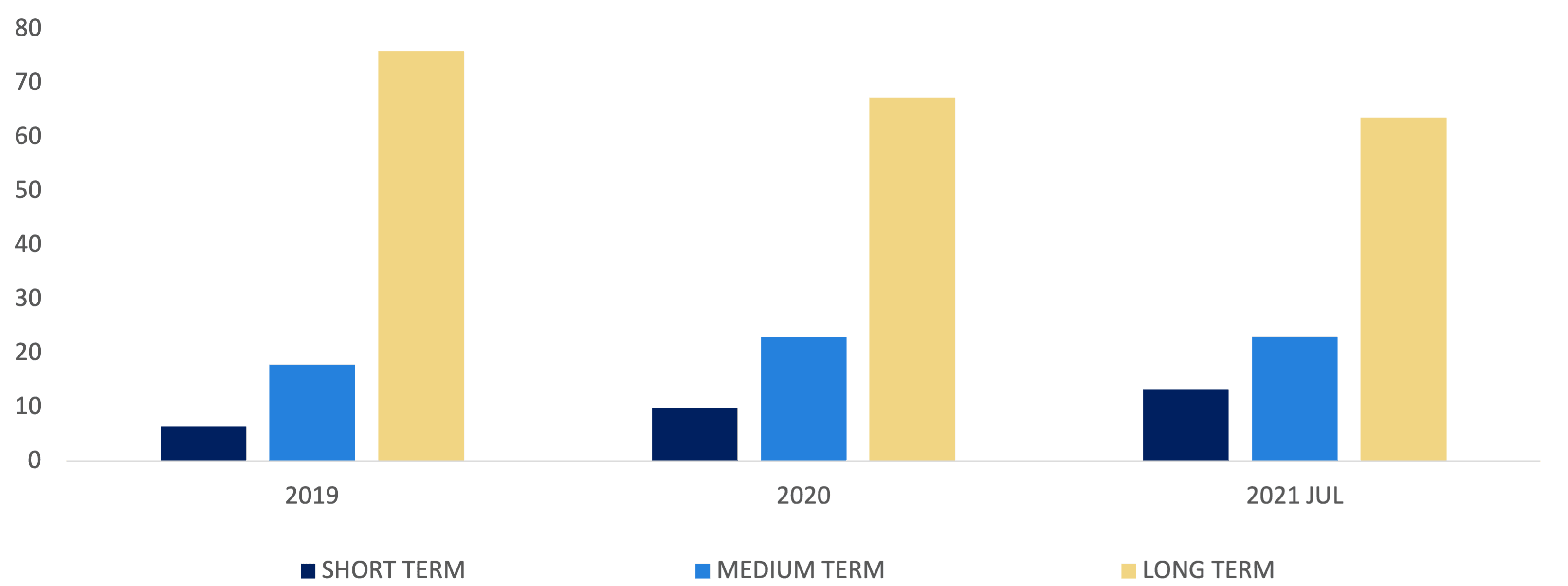 With regard to the debt maturity profile, as of July 2021 medium to long term debt accounted for 86.7% of total debt. Given this, rollover risk is low as short term debt is only 13.3% of total debt (Table 6). We do note that short term debt increased from 6.1% in 2019 to the current level as the government has to raise much needed funds amidst market risk aversion.