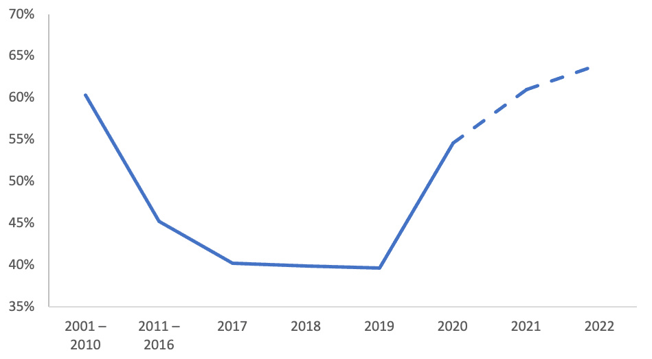 Debt-to-GDP has consistently been on a downtrend during the pre-pandemic years