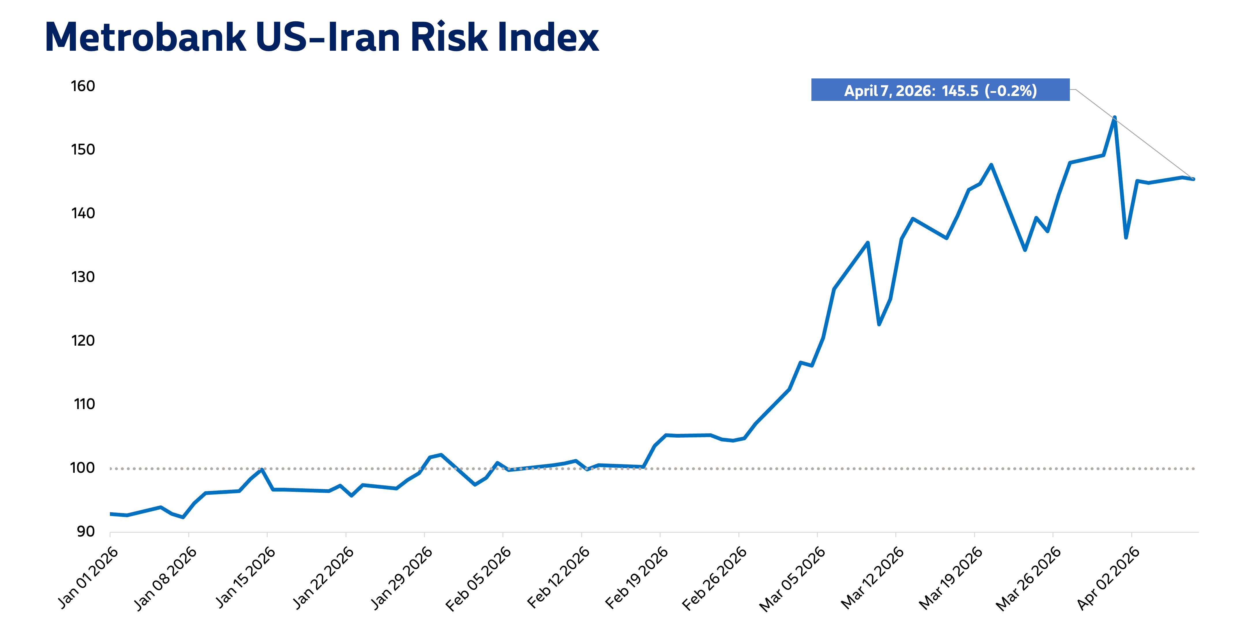 Metrobank’s US-Iran Risk Index settled at 145.5 on April 7, 0.2% lower than its value on the day before.