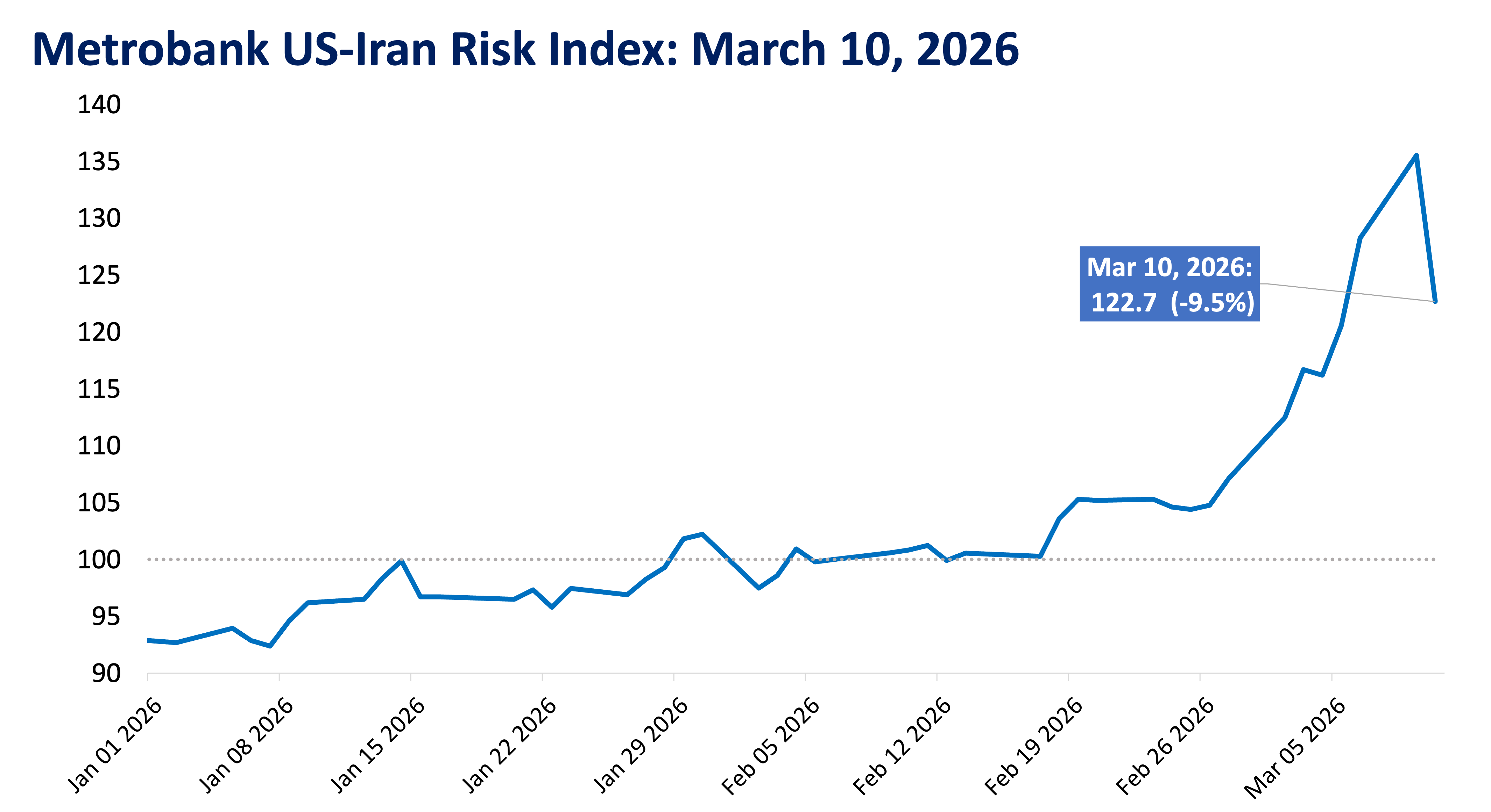 Metrobank Research’s US-Iran Risk Index measures the amount of risk that the ongoing conflict presents to financial markets. It considers the general risk sentiment of investors and inflationary pressures brought on by the conflict. A value of 100 denotes a normal level of risk based on market levels prior to the conflict’s escalation, while values greater than 100 imply increasing levels of risk.