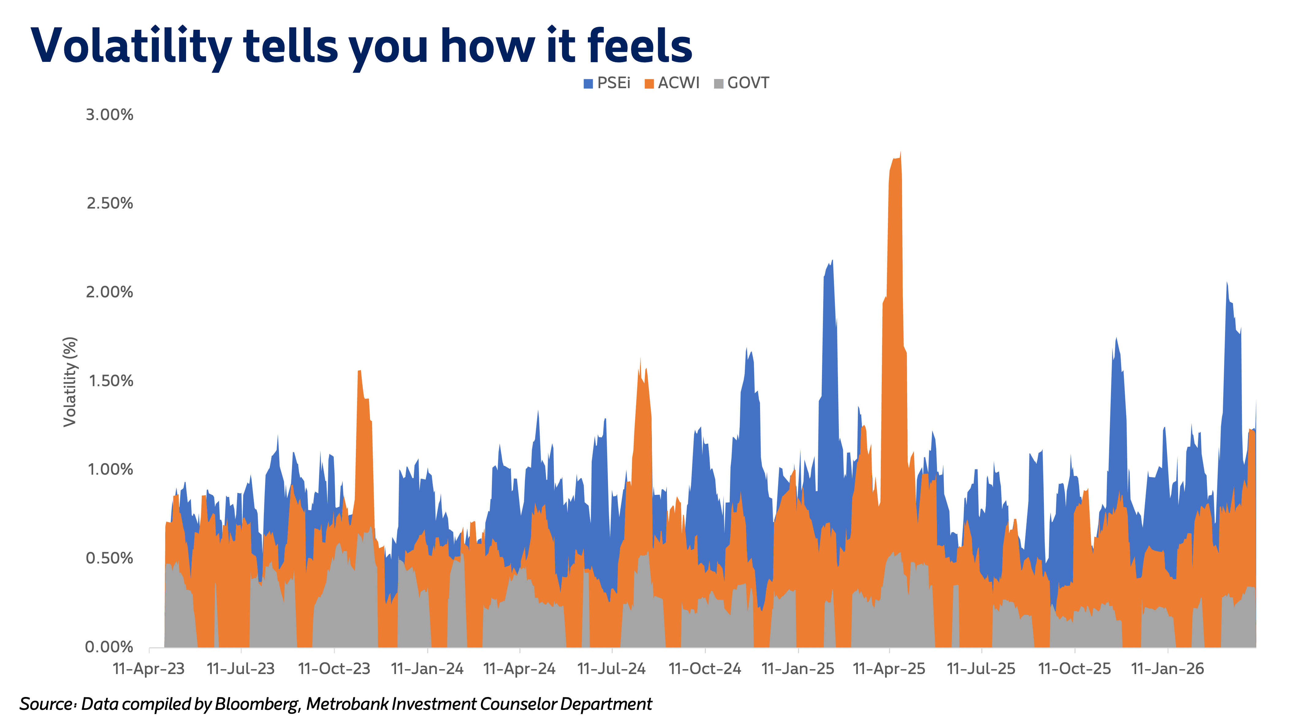 Stress testing is not about the outcome. Chart 2 shows short-term rolling volatility for the same three assets: PSEi, MSCI ACWI, and US government bonds.
