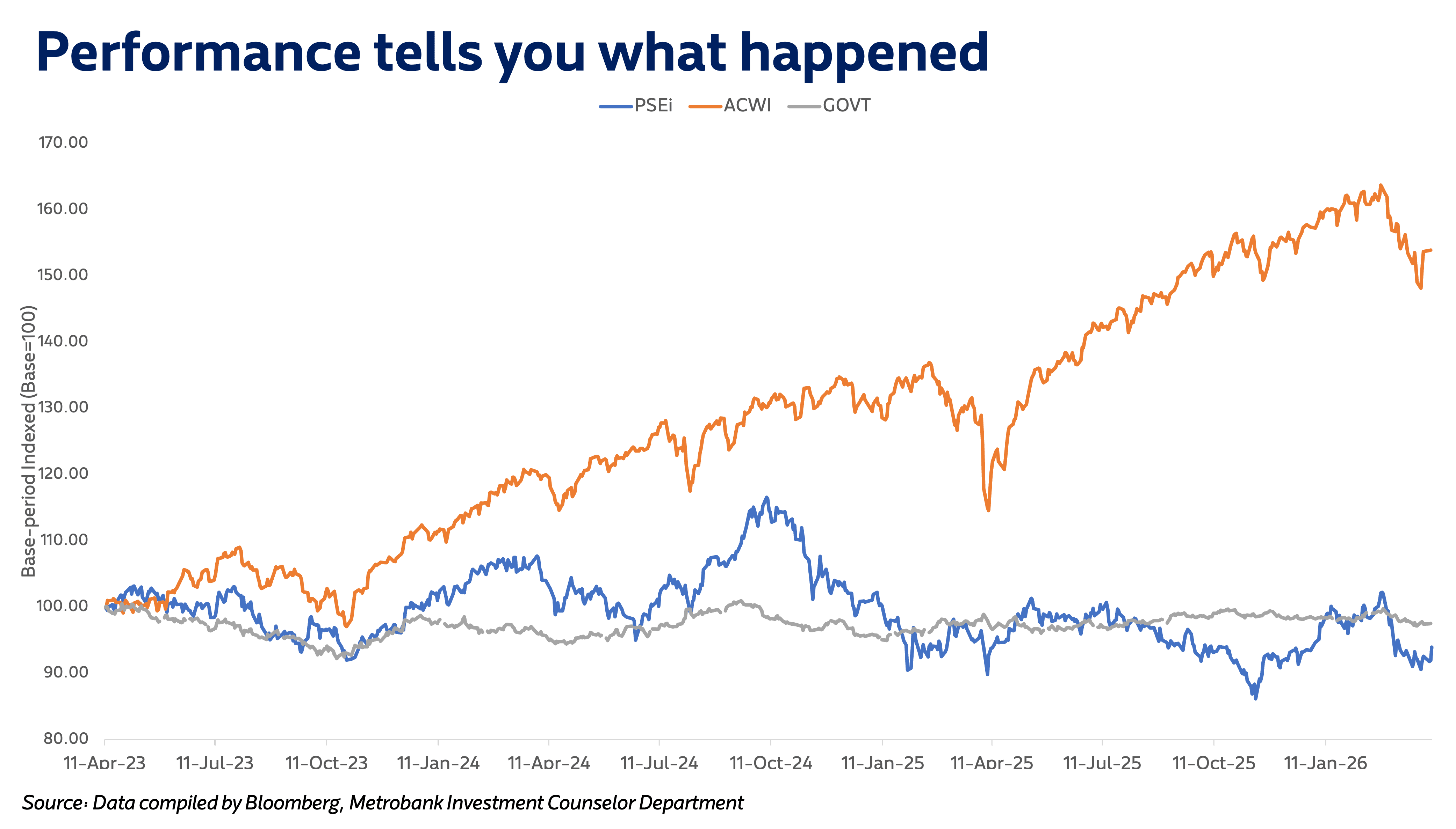 It compares three familiar building blocks of many portfolios: Philippine equities (PSEi), global equities (MSCI ACWI), and government bonds (proxied by GOVT: iShares US Treasury Bond ETF)—with all assets indexed to a base value of 100.